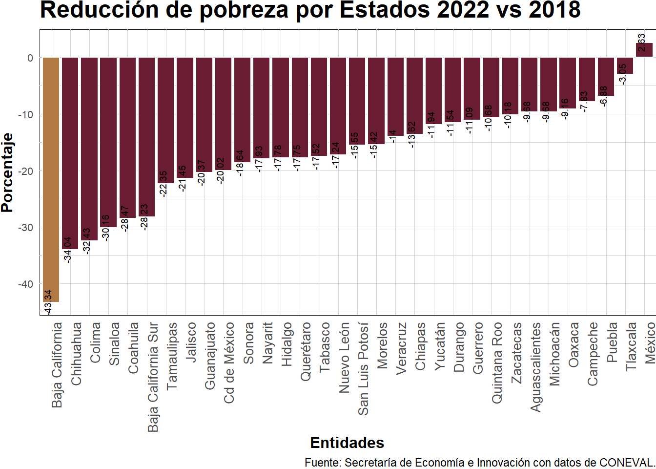 G_3 <- G.3%>%ggplot(aes(x =reorder(Entidades, Reduccion), y = Reduccion))+geom_bar(stat ="identity", color ="white", fill =ifelse(G.3$Entidades=="Baja California","#b17a45","#6a1c32")) +geom_text(aes(label= Reduccion), angle=90,vjust=0, hjust=0.5, color="black", size=2.5, face ="bold")+labs( title ="Reducción de pobreza por Estados 2022 vs 2018", y="Porcentaje", x="Entidades")+theme_minimal()+theme(plot.title =element_text(family ="Montserrat", size =18, face ="bold"),axis.title =element_text(family ="Montserrat", size =12, face ="bold"),axis.text =element_text(family ="Montserrat", size =8),axis.text.x =element_text(angle=90, hjust=1,family ="Montserrat", size =10),panel.background =element_rect(fill ="#FFFFFF", color ="#000000", size =0.01, linetype ="solid"),panel.grid =element_line(color ="#D1D1D1", size =0.01),plot.margin =margin(0,0,0,0, "cm"))+labs(caption ="Fuente: Secretaría de Economía e Innovación con datos de CONEVAL.")+scale_y_continuous(labels = scales::comma_format())print(G_3)