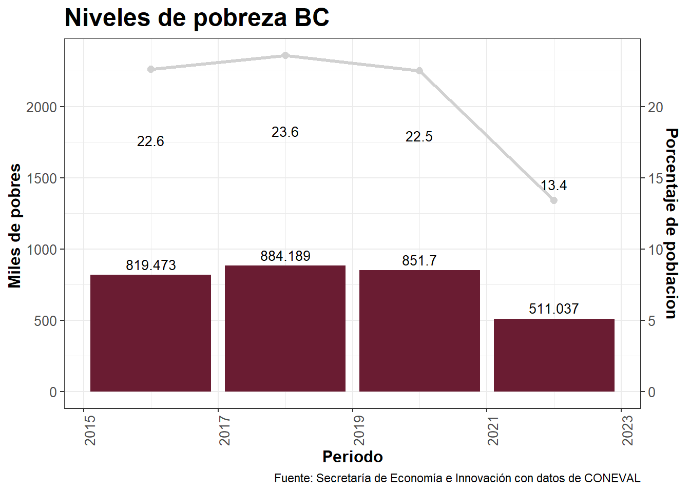 factor <-100G_1<- G.1%>%filter(Entidades=="Baja California") %>%ggplot(aes(x =`Año`, y =`Miles de personas`))+geom_bar(stat ="identity", fill="#6a1c32")+geom_text(aes(label=`Miles de personas`), vjust=-0.5, color="black", size=3.5)+geom_line(aes(y=`Porcentual`*factor), color="#D1D1D1", group=1, size=1.2)+geom_text(aes(label=`Porcentual`), vjust=-12, color="black", size=3.5)+geom_point(aes(y=`Porcentual`*factor), color="#D1D1D1", size=2.2)+scale_y_continuous(sec.axis =sec_axis(trans =~./factor, name ="Porcentaje de poblacion"))+labs(title ="Niveles de pobreza BC", x ="Periodo", y ="Miles de pobres ")+theme_bw()+theme(plot.title =element_text(family ="Montserrat", size =18, face ="bold"),axis.title =element_text(family ="Montserrat", size =12, face ="bold"),axis.text =element_text(family ="Montserrat", size =10),axis.text.x =element_text(angle=90, hjust=1,family ="Montserrat", size =10))+labs(caption ="Fuente: Secretaría de Economía e Innovación con datos de CONEVAL")print(G_1)