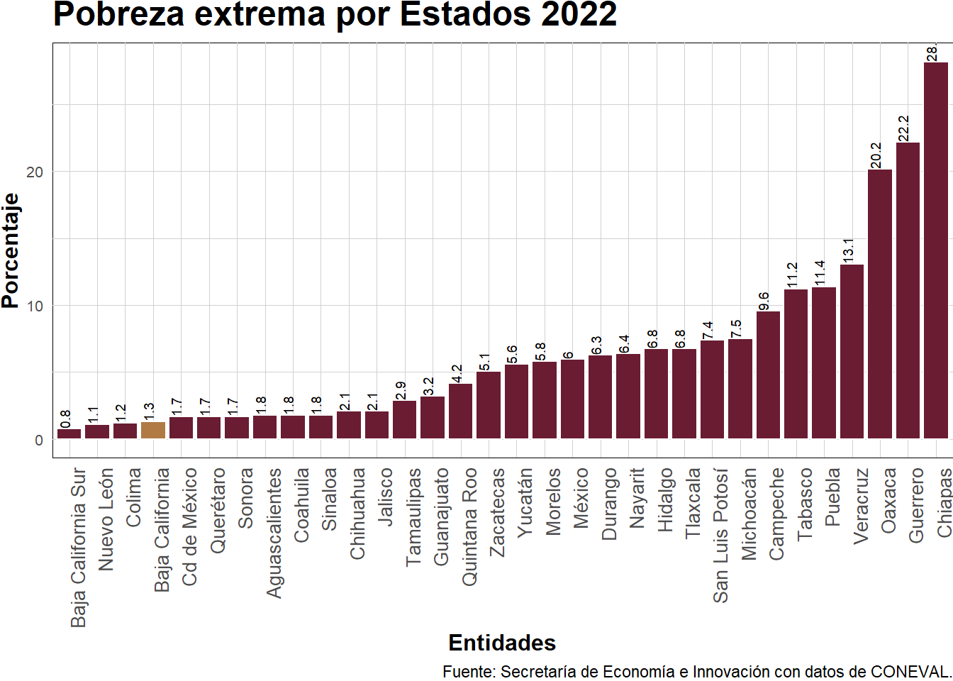 G_4 <- G.4%>%ggplot(aes(x =reorder(Entidades,Porcentaje), y = Porcentaje))+geom_bar(stat ="identity", color ="white", fill =ifelse(G.3$Entidades=="Baja California","#b17a45","#6a1c32")) +geom_text(aes(label= Porcentaje), angle=90,vjust=0, hjust=0.0, color="black", size=2.5, face ="bold")+labs( title ="Pobreza extrema por Estados 2022", y="Porcentaje", x="Entidades")+theme_minimal()+theme(plot.title =element_text(family ="Montserrat", size =18, face ="bold"),axis.title =element_text(family ="Montserrat", size =12, face ="bold"),axis.text =element_text(family ="Montserrat", size =8),axis.text.x =element_text(angle=90, hjust=1,family ="Montserrat", size =10),panel.background =element_rect(fill ="#FFFFFF", color ="#000000", size =0.01, linetype ="solid"),panel.grid =element_line(color ="#D1D1D1", size =0.01),plot.margin =margin(0,0,0,0, "cm"))+labs(caption ="Fuente: Secretaría de Economía e Innovación con datos de CONEVAL.")+scale_y_continuous(labels = scales::comma_format())print(G_4)