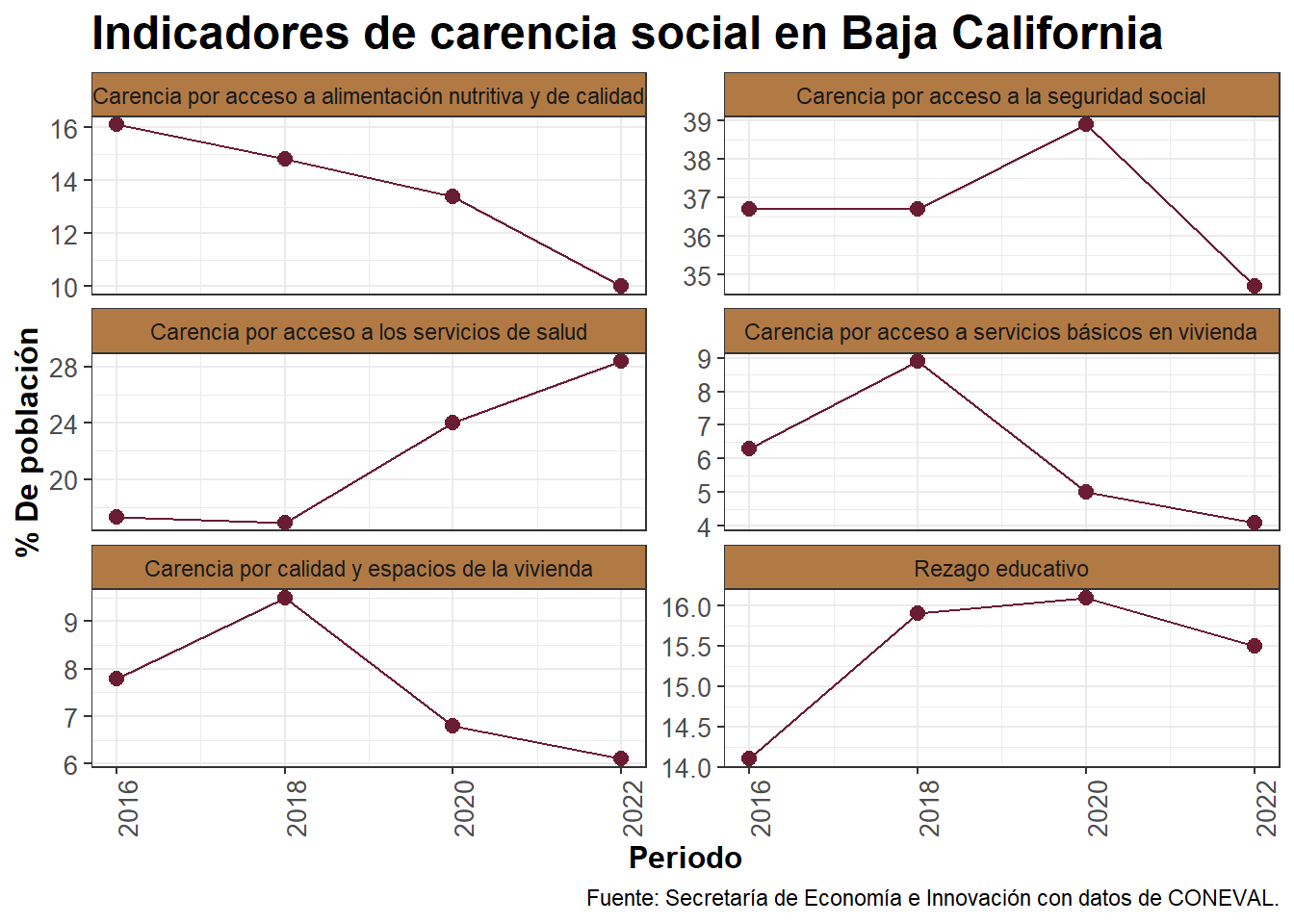 G_2 <- G.2%>%filter(Concepto =="Carencia por acceso a alimentación nutritiva y de calidad"|Concepto=="Carencia por acceso a servicios básicos en vivienda"|Concepto=="Carencia por calidad y espacios de la vivienda"|Concepto=="Carencia por acceso a la seguridad social"|Concepto=="Carencia por acceso a la seguridad social"|Concepto=="Rezago educativo"|Concepto=="Carencia por acceso a los servicios de salud") %>%ggplot(mapping=aes(Periodo,Porcentaje))+geom_line(aes(group =1), color ="#6a1c32", alpha =2.0)+geom_point(size=2.5, color="#6a1c32")+facet_wrap(Concepto~., ncol =2, scales ="free_y")+labs(title="Indicadores de carencia social en Baja California",y="% De población", x="Periodo")+theme_bw()+theme(plot.title =element_text(family ="Montserrat", size =18, face ="bold"),axis.title =element_text(family ="Montserrat", size =12, face ="bold"),axis.text =element_text(family ="Montserrat", size =10),axis.text.x =element_text(angle=90, hjust=1,family ="Montserrat", size =10),strip.background =element_rect(fill ="#b17a45"))+labs(caption ="Fuente: Secretaría de Economía e Innovación con datos de CONEVAL.")print(G_2)