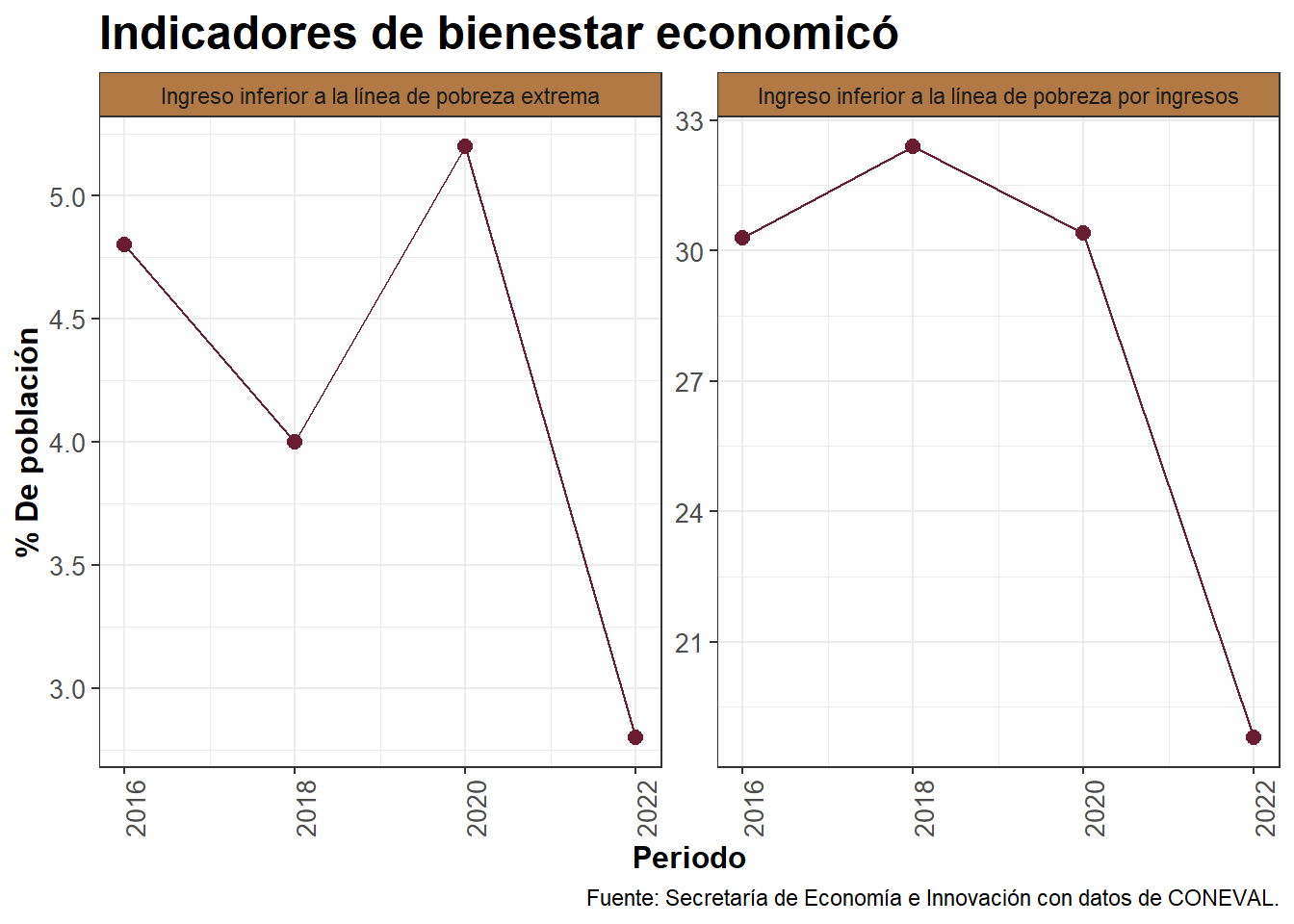 G_5 <- G.2%>%filter(Concepto=="Ingreso inferior a la línea de pobreza por ingresos"|Concepto=="Ingreso inferior a la línea de pobreza extrema") %>%ggplot(mapping=aes(Periodo,Porcentaje))+geom_line(aes(group =1), color ="#6a1c32", alpha =2.0)+geom_point(size=2.5, color="#6a1c32")+facet_wrap(Concepto~., ncol =2, scales ="free_y")+labs(title="Indicadores de bienestar economicó",y="% De población", x="Periodo")+theme_bw()+theme(plot.title =element_text(family ="Montserrat", size =18, face ="bold"),axis.title =element_text(family ="Montserrat", size =12, face ="bold"),axis.text =element_text(family ="Montserrat", size =10),axis.text.x =element_text(angle=90, hjust=1,family ="Montserrat", size =10),strip.background =element_rect(fill ="#b17a45"))+labs(caption ="Fuente: Secretaría de Economía e Innovación con datos de CONEVAL.")print(G_5)