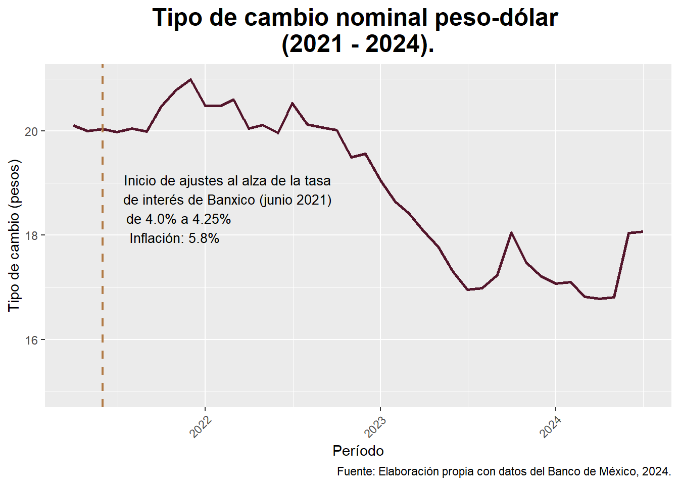 # Convertir la columna "Período" a formato de fechadata$Período <-as.Date(data$Período, format ="%Y-%m-%d")# Crear el gráfico de líneas del tipo de cambio nominalggplot(data, aes(x = Período, y =`TC nominal`)) +geom_line(color ="#53152b", size =1) +# Establecer el límite inferior del eje Y en 15expand_limits(y =15) +# Agregar una línea vertical en junio de 2021 con comentario sobre el inicio de la política monetaria restrictivageom_vline(xintercept =as.Date("2021-06-01"), linetype ="dashed", color ="#b17a45", size =0.8) +annotate("text", x =as.Date("2021-06-01"), y =max(data$`TC nominal`) -0.5, label ="Inicio de ajustes al alza de la tasa \nde interés de Banxico (junio 2021)\n de 4.0% a 4.25%\n Inflación: 5.8%", color ="black", vjust =2, hjust =-0.1, size =3.5) +# Título y etiquetaslabs(title ="Tipo de cambio nominal peso-dólar \n(2021 - 2024).",x ="Período",y ="Tipo de cambio (pesos)",caption ="Fuente: Elaboración propia con datos del Banco de México, 2024." ) +# Ajustes de tematheme(plot.title =element_text(size =18, face ="bold", hjust =0.5),axis.text.x =element_text(angle =45, hjust =1) # Rotar etiquetas del eje X para mejor legibilidad )