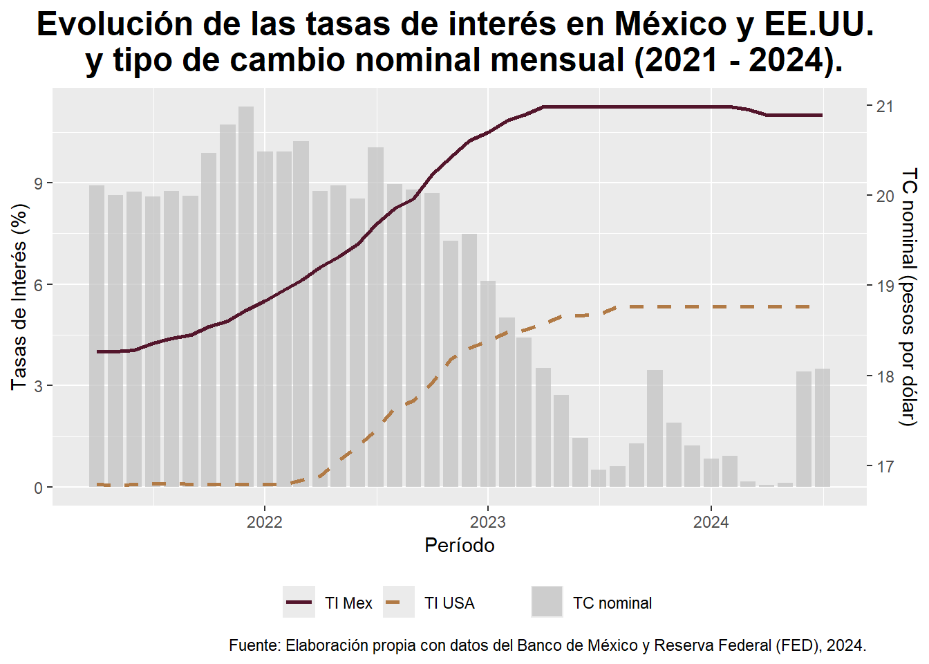 # Escalar TC nominal para que esté en un rango comparable con TI Mex y TI USAmax_TI <-max(c(data$`TI Mex`, data$`TI USA`), na.rm =TRUE)min_TI <-min(c(data$`TI Mex`, data$`TI USA`), na.rm =TRUE)range_TI <- max_TI - min_TImax_TC_Nom <-max(data$`TC nominal`, na.rm =TRUE)min_TC_Nom <-min(data$`TC nominal`, na.rm =TRUE)range_TC_Nom <- max_TC_Nom - min_TC_Nom# Escalar el TC de cambio nominal para que se ajuste al rango de las tasas de interésdata$TC_Nom_Escalado <- ((data$`TC nominal`- min_TC_Nom) / range_TC_Nom) * range_TI + min_TI# Crear el gráficoggplot(data, aes(x = Período)) +# Barras para TC nominal escaladogeom_bar(aes(y = TC_Nom_Escalado, fill ="TC nominal"), stat ="identity", alpha =0.7) +# Línea para TI Mexgeom_line(aes(y =`TI Mex`, color ="TI Mex"), size =1) +# Línea para TI USAgeom_line(aes(y =`TI USA`, color ="TI USA"), size =1, linetype ="dashed") +# Configurar el primer eje Y para las tasas de interésscale_y_continuous(name ="Tasas de Interés (%)",sec.axis =sec_axis(~ (.-min_TI)*(range_TC_Nom/range_TI) + min_TC_Nom, name ="TC nominal (pesos por dólar)") ) +# Título y etiquetaslabs(title ="Evolución de las tasas de interés en México y EE.UU. \n y tipo de cambio nominal mensual (2021 - 2024).",x ="Período",caption ="Fuente: Elaboración propia con datos del Banco de México y Reserva Federal (FED), 2024." ) +# Personalizar colores de las líneas y barrasscale_color_manual(values =c("TI Mex"="#53152b", "TI USA"="#b17a45"), name =" ") +scale_fill_manual(values =c("TC nominal"="#c0c0c0"), name =" ") +# Ajustes de tematheme_gray() +theme(axis.title.y.left =element_text(color ="black"),axis.title.y.right =element_text(color ="black"),legend.position ="bottom",plot.title =element_text(size =18, face ="bold", hjust =0.5) # Cambiar tamaño y estilo (opcional) )