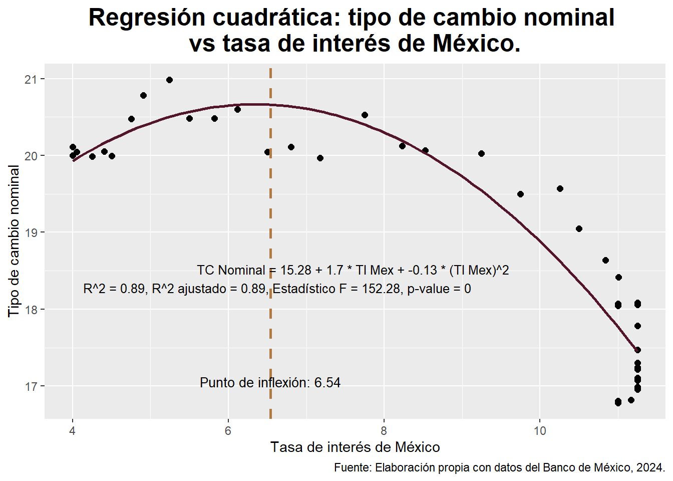 # Agregar una nueva columna con el cuadrado de TI Mexdata$TI_Mex_Cuadrado <- data$`TI Mex`^2# Realizar la regresión lineal con TI Mex y TI Mex^2 como variables explicativasmodelo <-lm(`TC nominal`~`TI Mex`+ TI_Mex_Cuadrado, data = data)# Crear el objeto 'detalles_modelo' con la función glance() para extraer R^2, F-estadístico, etc.detalles_modelo <-glance(modelo)# Extraer los coeficientescoeficientes <-coef(modelo)intercepto <-round(coeficientes[1], 2)pendiente <-round(coeficientes[2], 2)pendiente_cuadrado <-round(coeficientes[3], 2)# Calcular el punto de inflexiónpunto_inflexion <--pendiente / (2* pendiente_cuadrado)# Extraer los valores de R^2, R^2 ajustado, F-estadístico y p-valor, redondeados a dos decimalesr_cuadrado <-round(detalles_modelo$r.squared, 2)r_cuadrado_ajustado <-round(detalles_modelo$adj.r.squared, 2)f_estadistico <-round(detalles_modelo$statistic, 2)p_value_f <-format(round(detalles_modelo$p.value, 2), scientific =FALSE)# Crear la ecuación como texto con los valores redondeados a dos decimalesecuacion <-paste0("TC Nominal = ", intercepto, " + ", pendiente, " * TI Mex + ", pendiente_cuadrado, " * (TI Mex)^2", "\nR^2 = ", r_cuadrado, ", R^2 ajustado = ", r_cuadrado_ajustado, ", Estadístico F = ", f_estadistico, ", p-value = ", p_value_f)# Crear la gráfica con la línea de regresión, punto de inflexión y la ecuaciónggplot(data, aes(x =`TI Mex`, y =`TC nominal`)) +geom_point(size =2) +# Puntos de los datosgeom_smooth(method ="lm", formula = y ~poly(x, 2), se =FALSE, color ="#53152b") +# Línea de regresión cuadráticageom_vline(xintercept = punto_inflexion, linetype ="dashed", color ="#b17a45", size =1) +# Línea en el punto de inflexiónannotate("text", x = punto_inflexion, y =min(data$`TC nominal`), label =paste0("Punto de inflexión: ", round(punto_inflexion, 2)), color ="black", vjust =-1.5, size =3.5) +# Etiqueta del punto de inflexiónlabs(title ="Regresión cuadrática: tipo de cambio nominal \nvs tasa de interés de México.",x ="Tasa de interés de México",y ="Tipo de cambio nominal",caption ="Fuente: Elaboración propia con datos del Banco de México, 2024.") +theme(plot.title =element_text(size =18, face ="bold", hjust =0.5) # Cambiar tamaño y estilo (opcional) ) +annotate("text", x =Inf, y =Inf, label = ecuacion, hjust =1.5, vjust =8.0, size =3.4, color ="black")