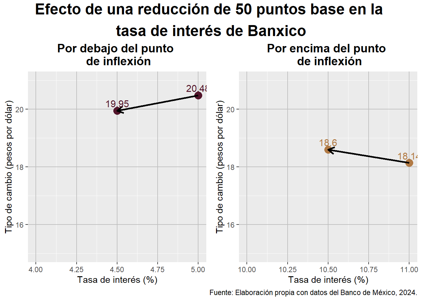 # Crear un dataframe con los ejemplos de reducción de tasas y sus respectivos cambios en el tipo de cambiodata_ejemplos <-data.frame(Tasa_Interes =c(5.0, 4.5, 11.0, 10.5),Tipo_Cambio =c(20.48, 19.95, 18.14, 18.60),Grupo =c("Por debajo del punto de inflexión", "Por debajo del punto de inflexión","Por encima del punto de inflexión", "Por encima del punto de inflexión"))# Crear el gráfico para el escenario por debajo del punto de inflexión con el fondo grisgrafico_debajo <-ggplot(subset(data_ejemplos, Grupo =="Por debajo del punto de inflexión"), aes(x = Tasa_Interes, y = Tipo_Cambio)) +geom_point(size =4, color ="#53152b") +geom_segment(aes(x = Tasa_Interes, y = Tipo_Cambio, xend = Tasa_Interes -0.5, yend =lead(Tipo_Cambio)), arrow =arrow(length =unit(0.3, "cm")), color ="black", size =1) +geom_text(aes(label =round(Tipo_Cambio, 2)), vjust =-0.5, size =4, color ="#53152b") +labs(title ="Por debajo del punto \n de inflexión", x ="Tasa de interés (%)", y ="Tipo de cambio (pesos por dólar)",caption =" ") +ylim(15, 21) +# Fijar el eje Y de 15 a 21 para la misma escalatheme_gray() +# Cambiar a tema gristheme(plot.title =element_text(hjust =0.5, size =14, face ="bold"),panel.grid.major =element_line(color ="gray") )# Crear el gráfico para el escenario por encima del punto de inflexión con el fondo grisgrafico_encima <-ggplot(subset(data_ejemplos, Grupo =="Por encima del punto de inflexión"), aes(x = Tasa_Interes, y = Tipo_Cambio)) +geom_point(size =4, color ="#b17a45") +geom_segment(aes(x = Tasa_Interes, y = Tipo_Cambio, xend = Tasa_Interes -0.5, yend =lead(Tipo_Cambio)), arrow =arrow(length =unit(0.3, "cm")), color ="black", size =1) +geom_text(aes(label =round(Tipo_Cambio, 2)), vjust =-0.5, size =4, color ="#b17a45") +labs(title ="Por encima del punto \n de inflexión", x ="Tasa de interés (%)", y ="Tipo de cambio (pesos por dólar)",caption ="Fuente: Elaboración propia con datos del Banco de México, 2024.") +ylim(15, 21) +# Fijar el eje Y de 15 a 21 para la misma escalatheme_gray() +# Cambiar a tema gristheme(plot.title =element_text(hjust =0.5, size =14, face ="bold"),panel.grid.major =element_line(color ="gray") )# Unir ambos gráficos en uno solo y agregar un título generalgrid.arrange(grafico_debajo, grafico_encima, ncol =2, top =textGrob("Efecto de una reducción de 50 puntos base en la \ntasa de interés de Banxico", gp =gpar(fontsize =18, fontface ="bold")))